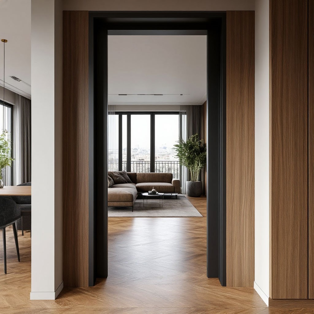 - В современном оформлении дверных проемов акцент делается на прямые линии и геометрические формы. Это может быть выполнено с помощью простых рамок или наличников, которые не имеют лишних деталей. Такой подход создает ощущение порядка и гармонии.