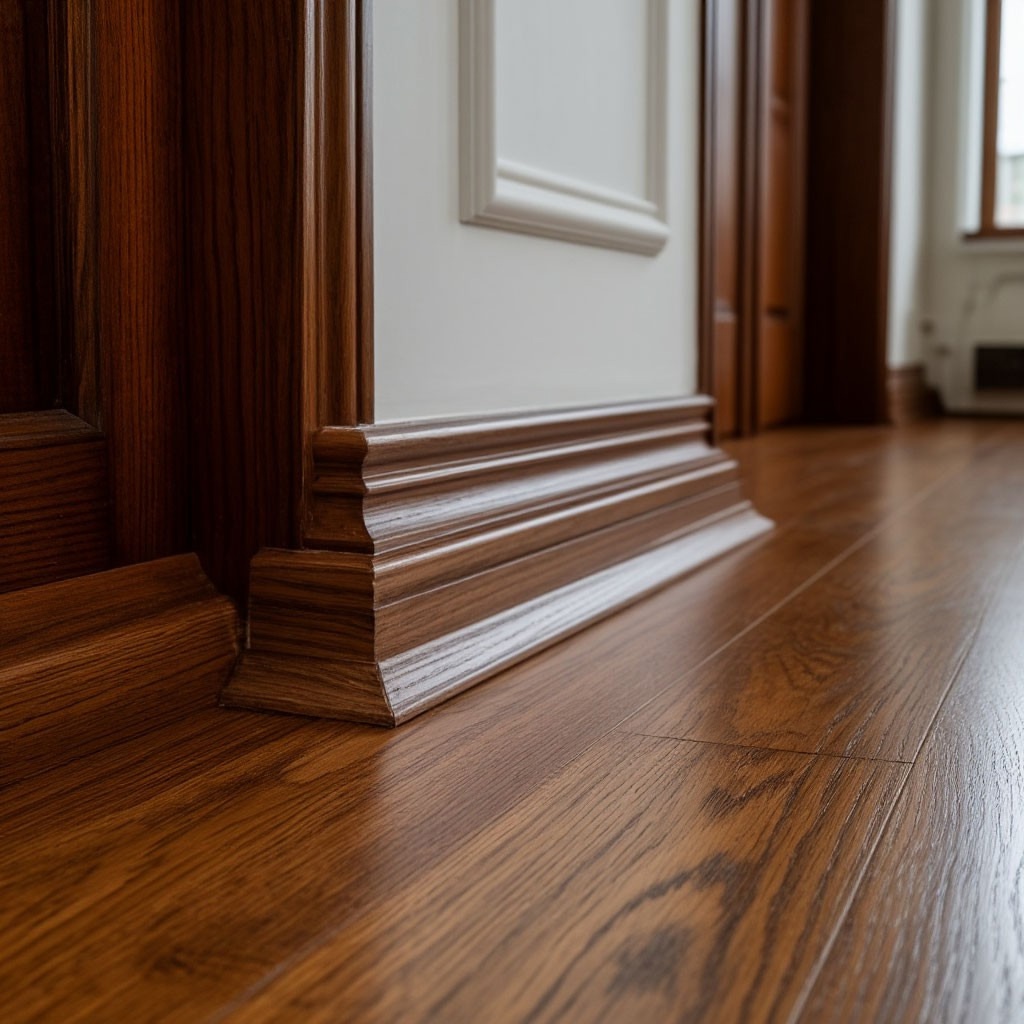 Деревянные плинтусы. Хорошо подходят для паркетной доски, так как они создают гармоничный и естественный вид. Дерево хорошо сочетается с натуральными материалами и обладает хорошей прочностью.