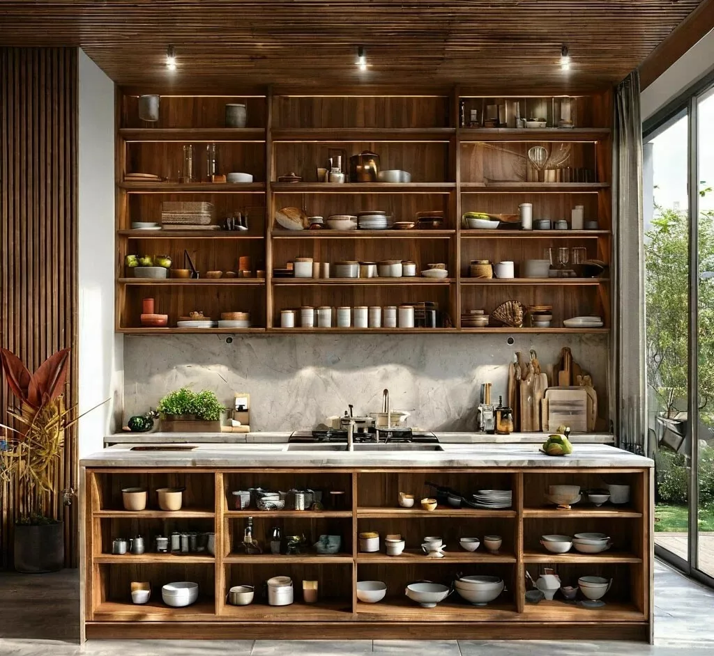 Доступны разные стили (классический, современный, минимализм). Исследуйте различные стили интерьера и выберите тот, который соответствует вашему вкусу и общему стилю кухни. Например, для классической кухни подойдут деревянные стеллажи с резьбой, а для современного интерьера — металлические конструкции с чистыми линиями.